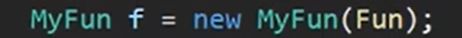 然后传入函数名,将函数装在委托里,委托的申明和类一样,