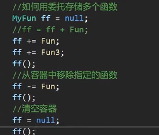 此时用委托存储一个Fun函数,再用+=可以实现存储两个ff函数,使用ff()时,会执行两次Fun函数。